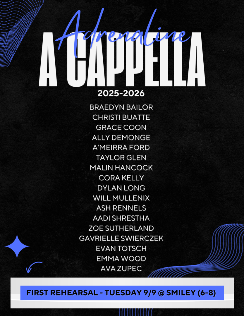 Adrenaline is OTHS’s premier a cappella ensemble. Music is performed entirely with voices, and repertoire includes popular music, unlike the traditional curricular choirs. Auditions are at the beginning of the school year.